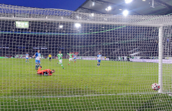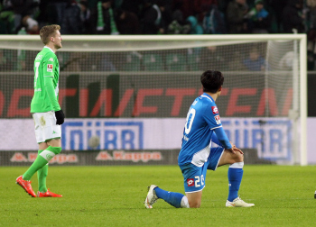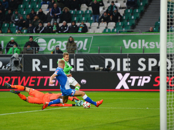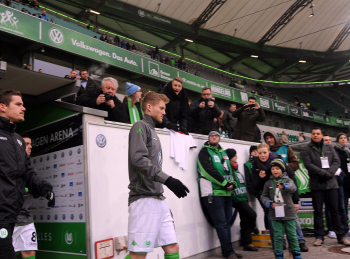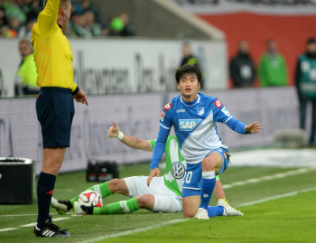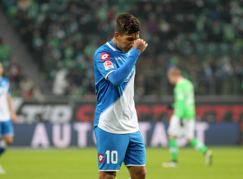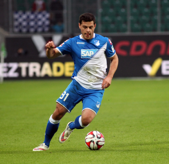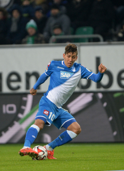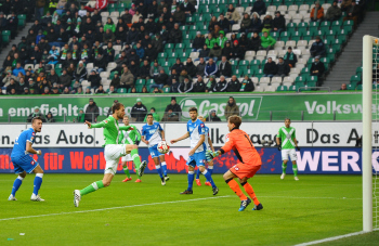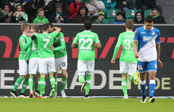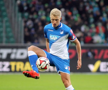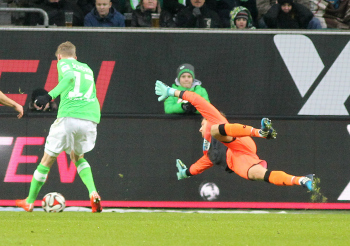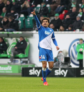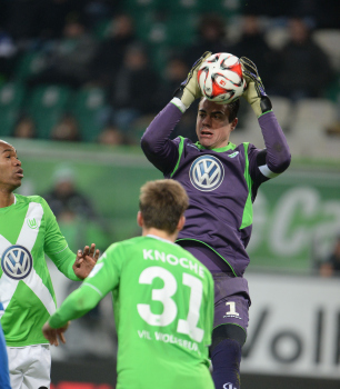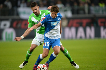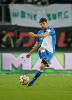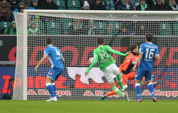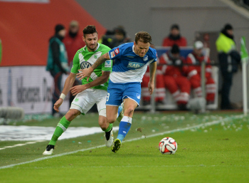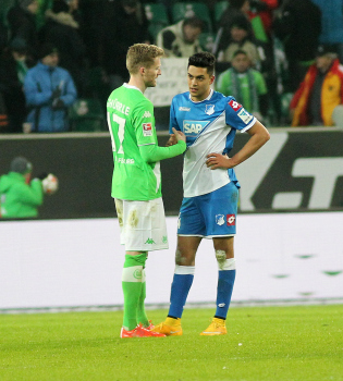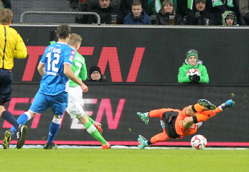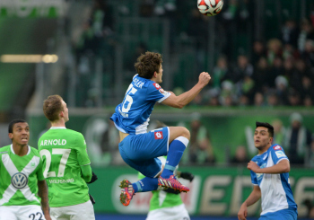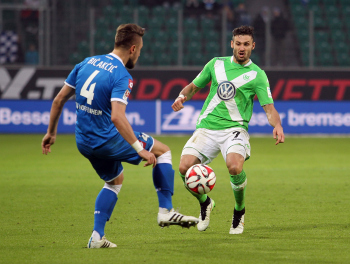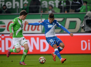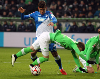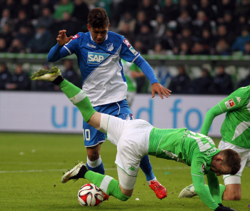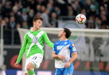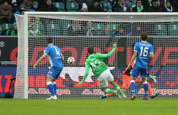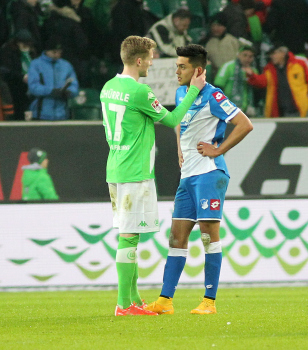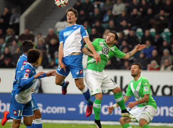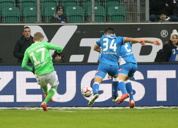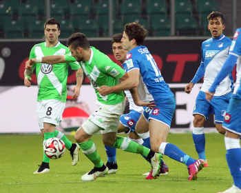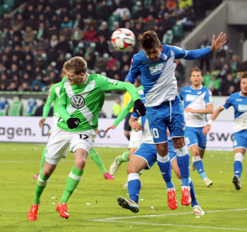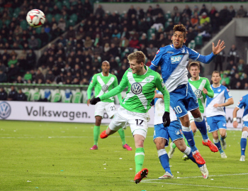 WOLFSBURG, DEUTSCHLAND. 07.02.2015, FUSSBALL - VfL Wolfsburg vs TSG 1899 Hoffenheim, 1. Bundesliga, Saison 2014-2015, Volkswagen Arena. Bild zeigt: Kopfballduell zwischen Pirmin SCHWEGLER (TSG 1899 Hoffenheim), VIEIRINHA (VfL Wolfsburg), Daniel CALIGIURI (VfL Wolfsburg),