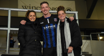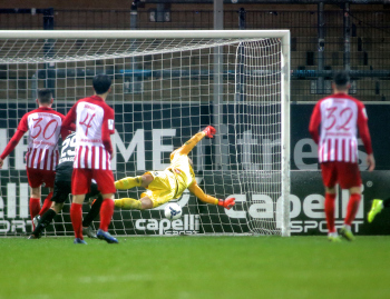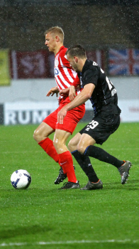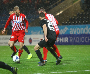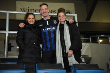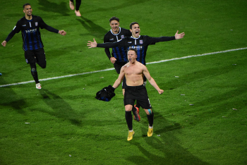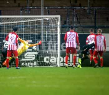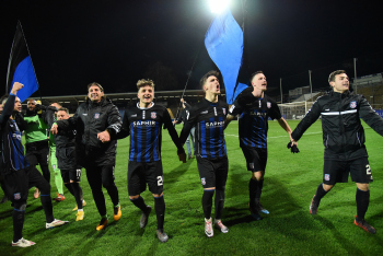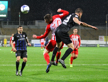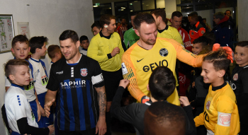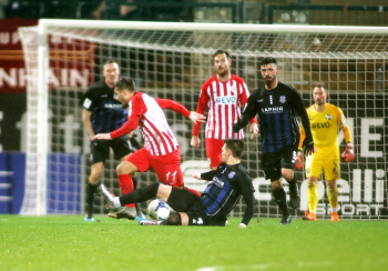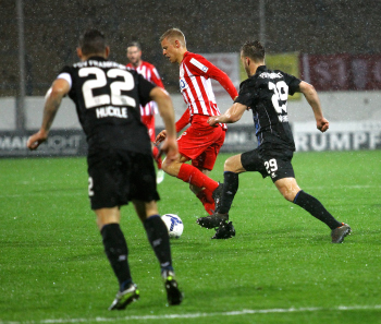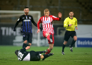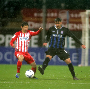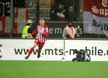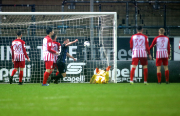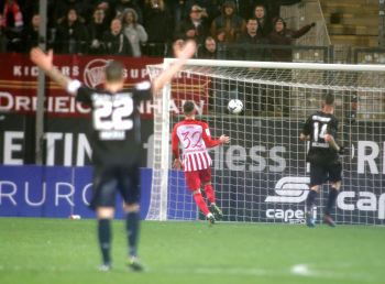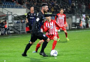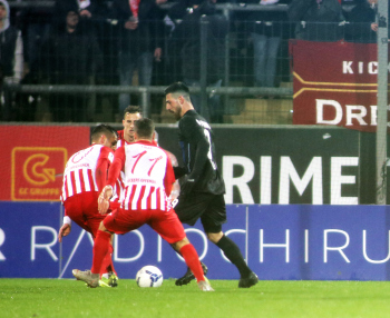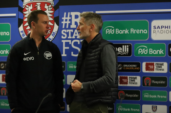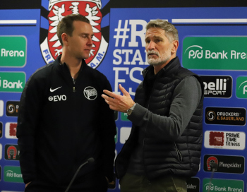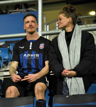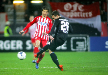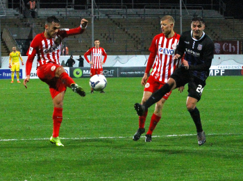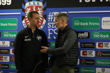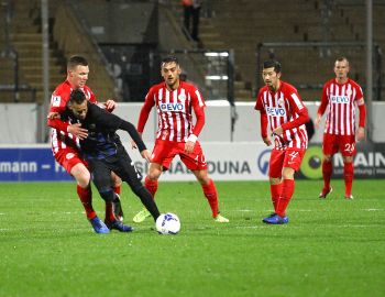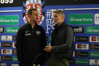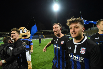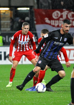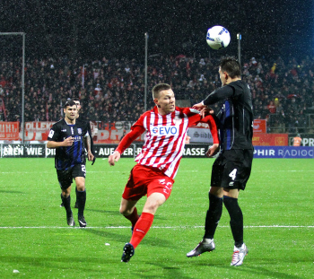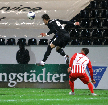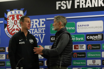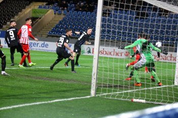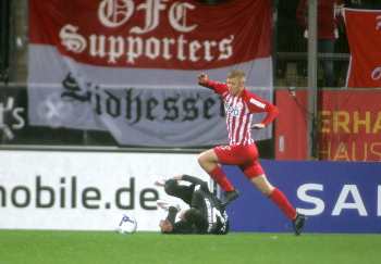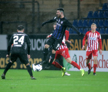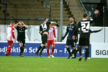 13.03.2019, xxx, Fussball Regionalliga Sued-West, PSD Bank Arena , Frankfurt am Main, FSV Frankfurt - Kickers Offenbach OFC; Nicht einverstanden sind Alexander Aschauer (FSV Frankfurt), Maziar Namavizadeh (FSV Frankfurt), und Kamil Tyminski (FSV Frankfurt), mit der Abseits Entscheidung