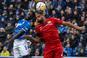 Kevin Akpoguma (TSG 1899 Hoffenheim) enttäuscht, Enttäuschung, Frust, frustriert, niedergeschlagen, Jubel und Freude bei Adam Hlozek und Jeremie Frimpong (Bayer 04 Leverkusen),, Torjubel des Torschützen Moussa Diaby (Bayer 04 Leverkusen).