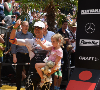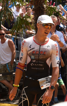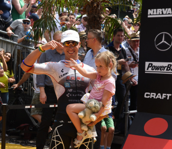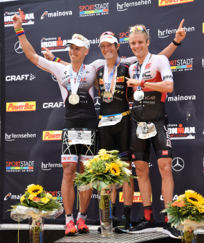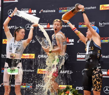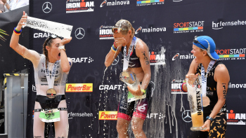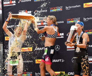 Sieger Sebastian Kienle (GER), Bierdusche bei der Siegerehrung1. Platz Sebastian Kienle (GER), 2. Platz Andi Boecherer (GER) und 3. Platz Patrik Nilsson (SWE)