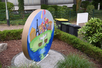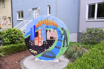 Kunstprojekt die Euro-Skulptur vor der Haustür der Dezernentin für Soziales, Senioren, Jugend und Recht, Daniela Birkenfeld wurde neu bemalt von Sieben Stipendiaten des East Side-Stipendiums des Vereins Polymer FM