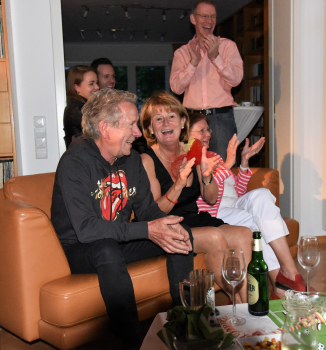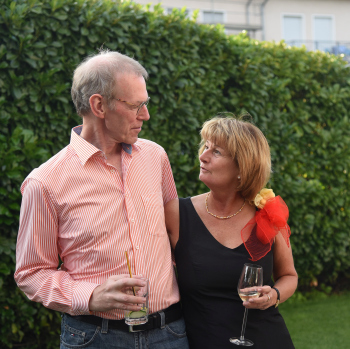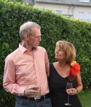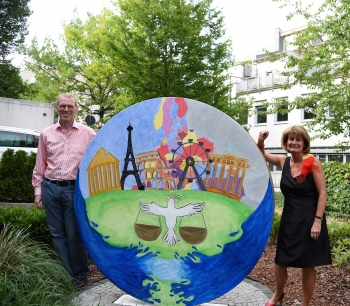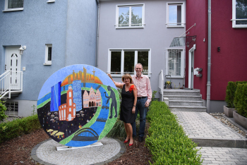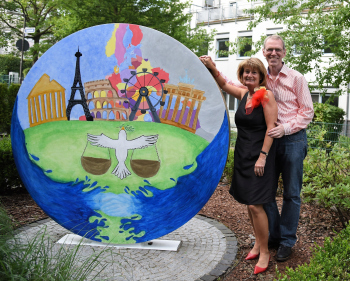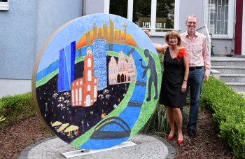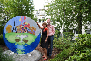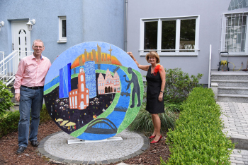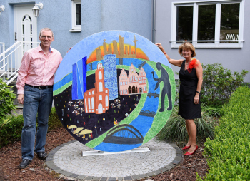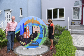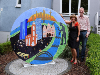 Bild zeig: Sozialdezernentin Prof. Dr. Daniela Birkenfeld (CDU, Frankfurt) mit ihrem Verlobten Literaturwissenschaftler Nicholas Strout mit der Rückseite der Skupltur