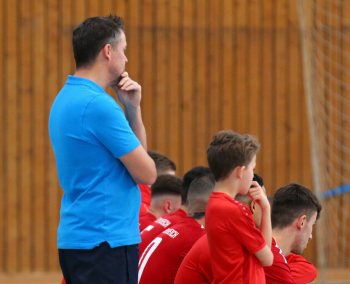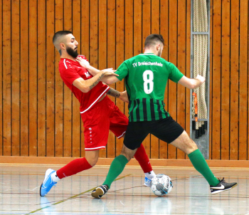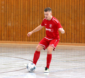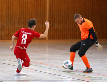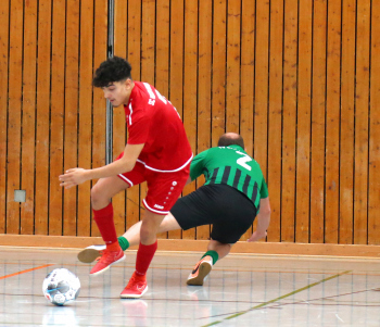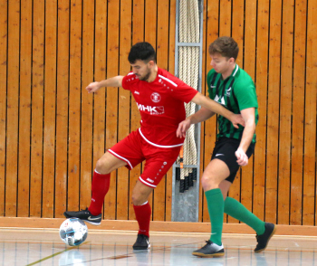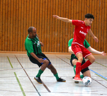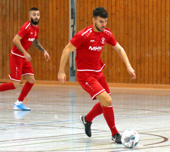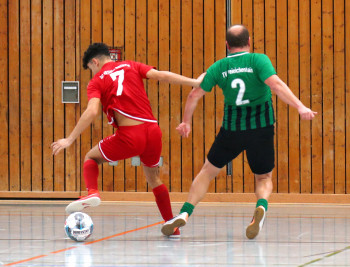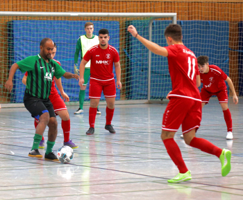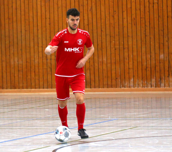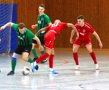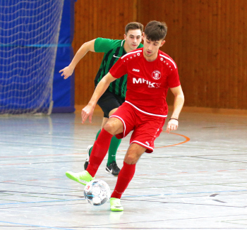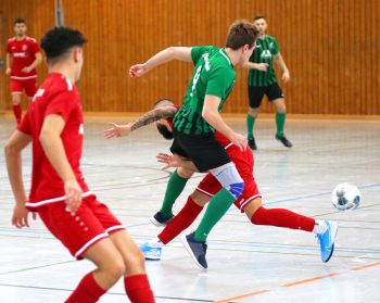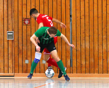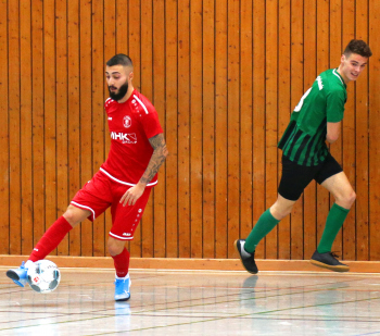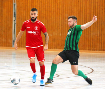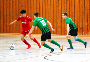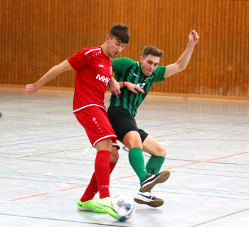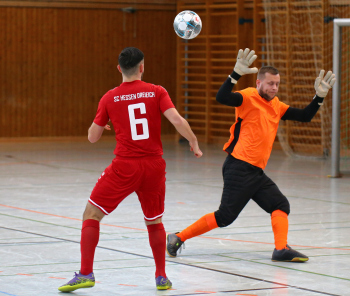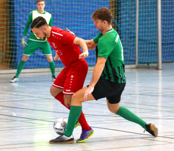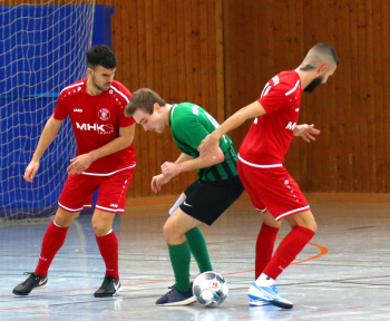 11.01.2020, xxx, Dreieich Fussball, Sprendlingen, Hans-Meudt-Halle, Stadtmeisterschaft Dreieich , Lotto Hessenliga, Saison 2019/2020, SC Hessen Dreieich gegen TV Dreieichenhain; vl in rot Besmir Haliti (SC Hessen Dreieich); David K?hler (TV Dreieichenhain; in rot Canel Burcu (SC Hessen Dreieich);