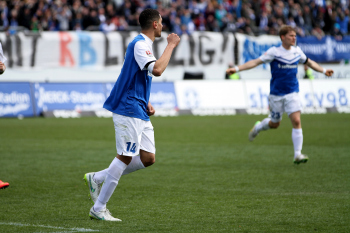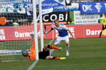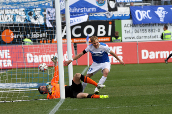 nach dem Tor zum 2:0 durch den Torsch?tzen Leon Balogun (SV Darmstadt) hier ist Torwart Michael Esser (Bochum) geschlagen, Hanno Behrens (Darmstadt) jubelt