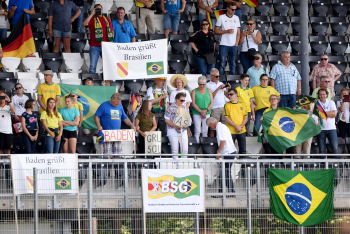 Feature, Brasilianische Fans aus Baden mit Transparent, Spruchband mit dem Text:Baden grüßt Brasilien und Brasilianischen Fahnen. Deutschland, Sandhausen: Sport, Fussball, Testlaenderspiel der Frauen: Deutschland vs Brasilien am 04.07.2017, BWT-Stadion Am Hardtwald. *** Quelle: Hartenfelser, hoehere Aufloesung auf Anfrage, Verwendung honorarpflichtig, Belegexemplar erbeten IBAN: DE04 5055 0020 0112 0515 70 SWIFT/BIC HELADEF10FF UST-Nummer 3582501720 MWST-Satz 7%