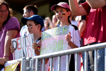 Feature, junge Fans mit selbstgemalten Plakaten. Deutschland, Sandhausen: Sport, Fussball, Testlaenderspiel der Frauen: Deutschland vs Brasilien am 04.07.2017, BWT-Stadion Am Hardtwald. *** Quelle: Hartenfelser, hoehere Aufloesung auf Anfrage, Verwendung honorarpflichtig, Belegexemplar erbeten IBAN: DE04 5055 0020 0112 0515 70 SWIFT/BIC HELADEF10FF UST-Nummer 3582501720 MWST-Satz 7%