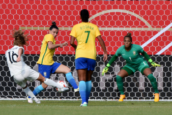 Linda Dallmann (GER), Francisleide (BRA), Rosana (BRA), Torwart Barbara (BRA). Deutschland, Sandhausen: Sport, Fussball, Testlaenderspiel der Frauen: Deutschland vs Brasilien am 04.07.2017, BWT-Stadion Am Hardtwald. *** Quelle: Hartenfelser, hoehere Aufloesung auf Anfrage, Verwendung honorarpflichtig, Belegexemplar erbeten IBAN: DE04 5055 0020 0112 0515 70 SWIFT/BIC HELADEF10FF UST-Nummer 3582501720 MWST-Satz 7%