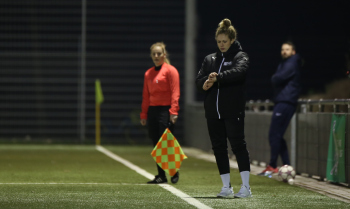 21.02.2018 xcex Deutschland, Frankfurt, Fussball, Frauenfussball 2. Frauen-Bundesliga Süd Saison 2017/2018 1. FFC Frankfurt II - TSV Schott Mainz Trainerin Kim Kulig (FFC) an der Seitenlinie, schaut auf die Uhr ***** Foto: A2/Hartenfelser