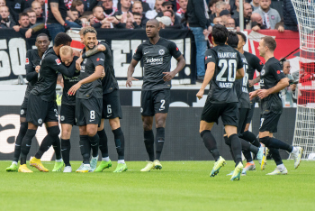 Frankfurter Torjubel, v.l. Ansgar Knauff, Torschütze Sebastian Rode, Evan Obite Ndicka, Makoto Hasebe (Eintracht Frankfurt).