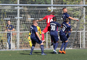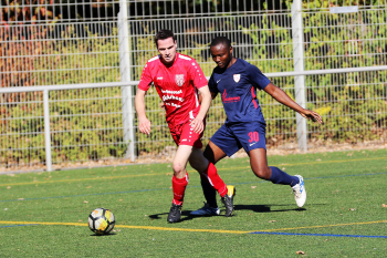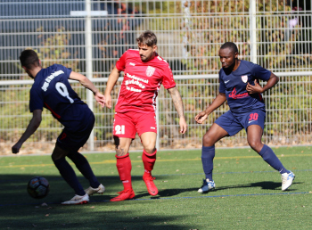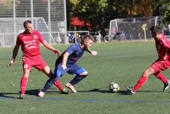 Lars Herkner und Paolo Alpha Ngue (SpVgg 03 Neu-IsenburgII) gegen Bernado Somma (SV Dreieichenhain )