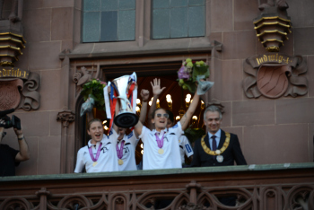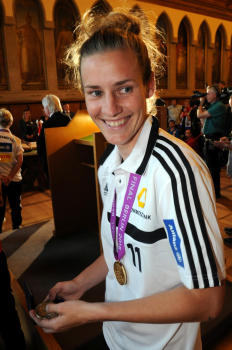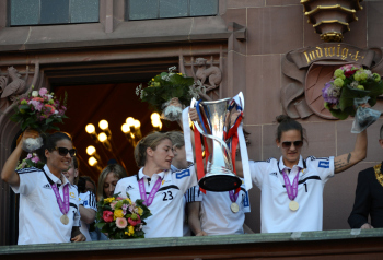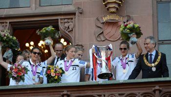 Schmidt, Bianca und Schumann, Desirée ( FFC Frankfurt) mit dem Pokal