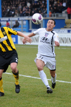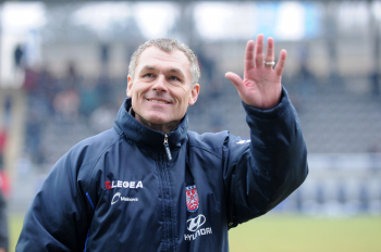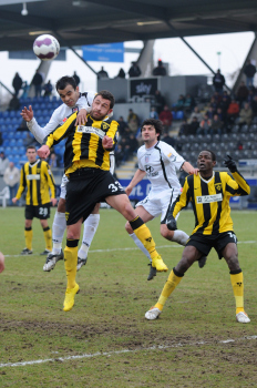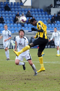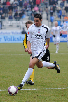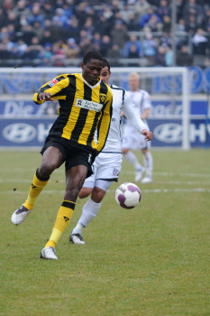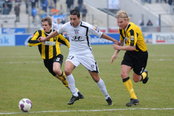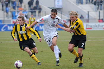 07.02.2010, 2. Bundesliga, 21. Spieltag: FSV Frankfurt vs Alemannia Aachen, Allan Jepsen (Aachen Nr. 3) und Nico Herzig (Aachen Nr. 2) vs Aziz Bouhaddouz (FSV Nr. 27)
