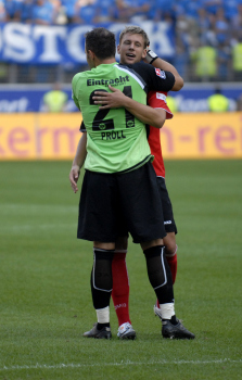 26.08.2007, Saison 2007/08 Eintracht Frankfurt vs Hansa Rostock, Jubel bei Torwart Markus Pr?ll und dem Torsch?tzen Alexander Meier