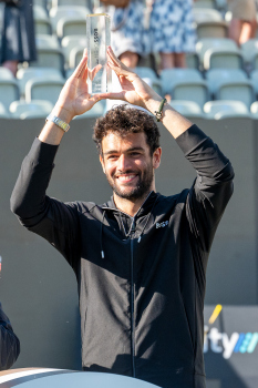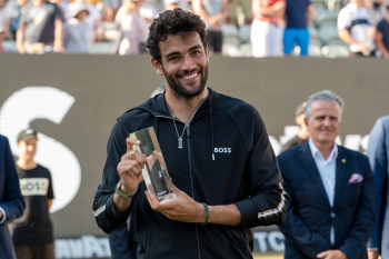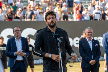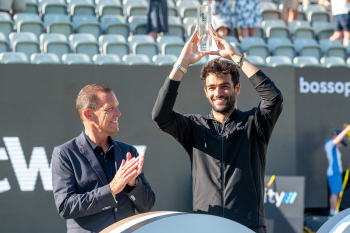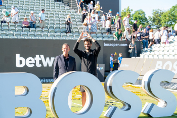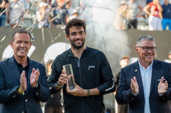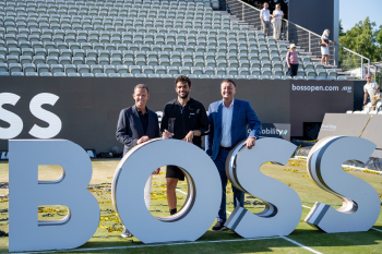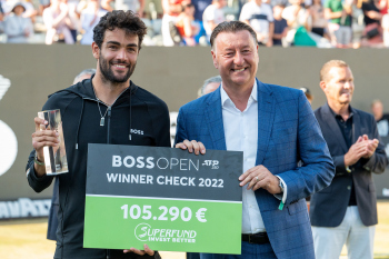 V.li. Turnierdirektor Edwin Weindorfer, Andy Murray (GBR), Vorstandsvorsitzender der Hugo Boss AG Daniel Grieder, Matteo Berrettini (ITA), Leiter Marketing Liqui Moly Dieter Baumann, Oberbürgermeister der Stadt Stuttgart Dr. Frank Nopper und Vorstand TC Weissenhof Gert Brandner.