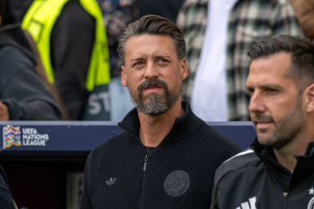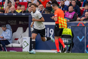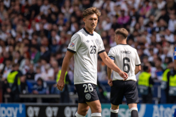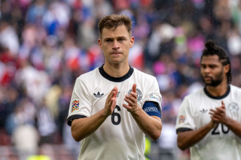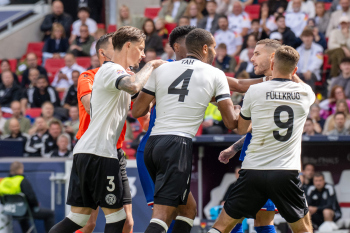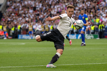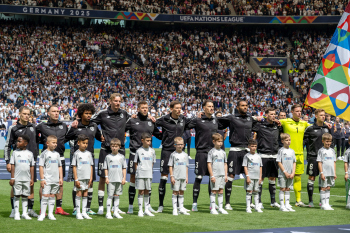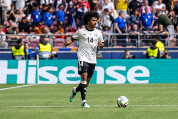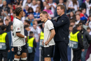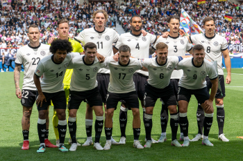 Die Startelf h.r.v.l David Raum, Torwart Marc-Andre ter Stegen, Nick Woltemade, Johnathan Tah, Robin Koch, Leon Goretzka (GER), v.r.v.l. Karim Adeyemi, Pascal Groß, Florian Wirtz, Joshua Kimmich und Niclas Füllkrug (GER).