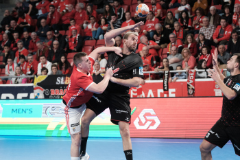 15.02.2020 xkhx Lissabon, Pavilhão da Luz Nº 2 Men's EHF Cup 2019/2020, Handball Benfica Lissabon gegen: MT Melsungen Julius Kühn (5, MT Melsungen) gegen Rene Toft Hansen (Benfica Lissabon)