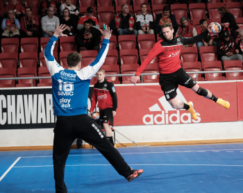 15.02.2020 xkhx Lissabon, Pavilhão da Luz Nº 2 Men's EHF Cup 2019/2020, Benfica Lissabon gegen: MT Melsungen Nebojsa Simic (16, MT Melsungen) gegen René Toft Hansen (Benfica Lissabon)