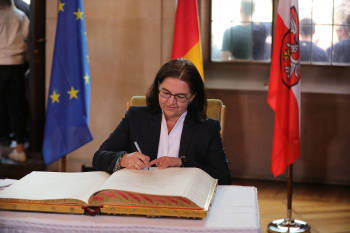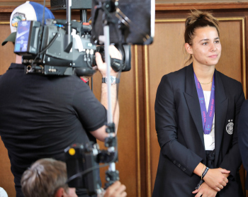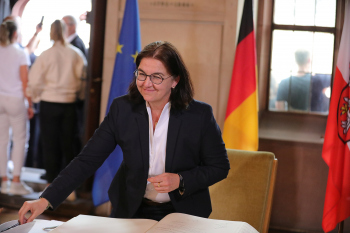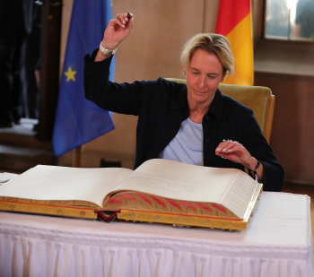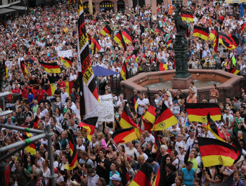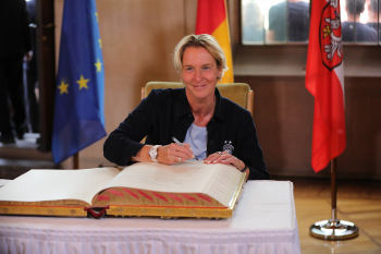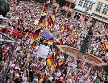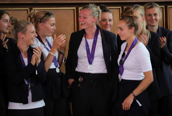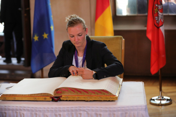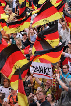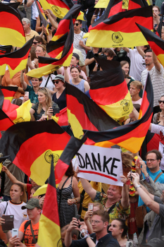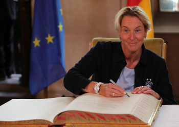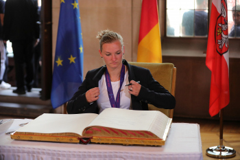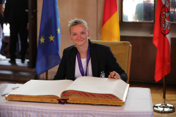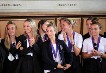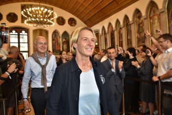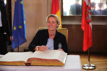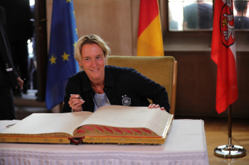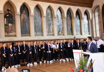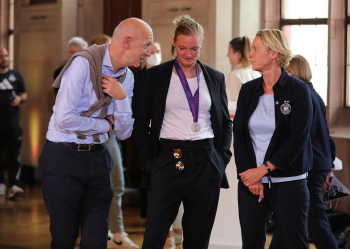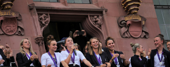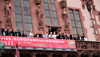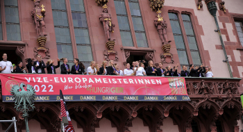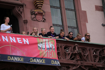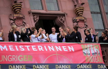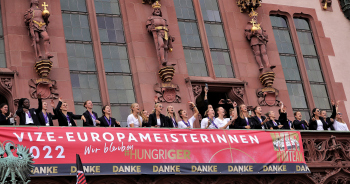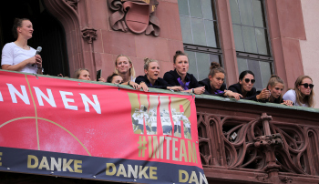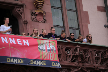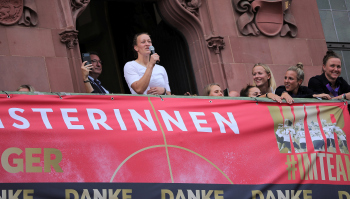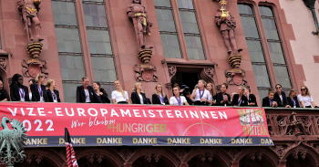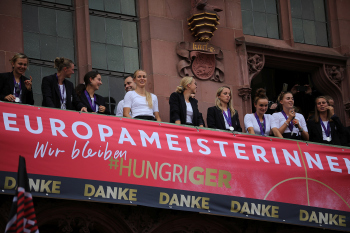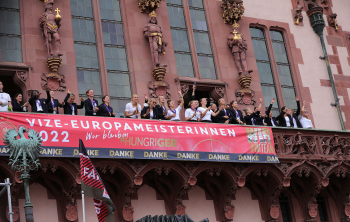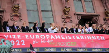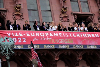 Nach ihrer Rückkehr vom EM-Finale in London wird die DFB-Frauen-Nationalmannschaft im Frankfurter Römer auf dem Balkon gefeiert