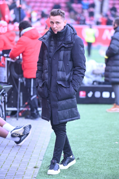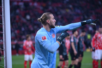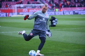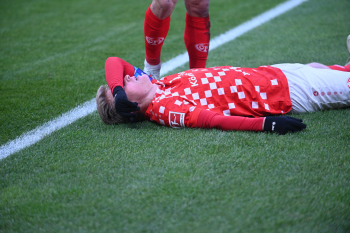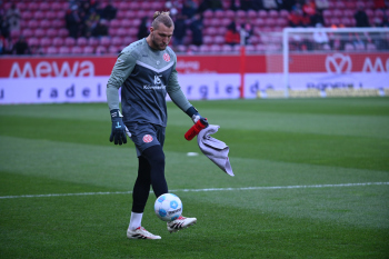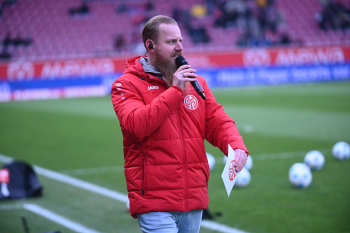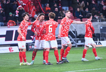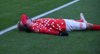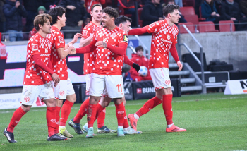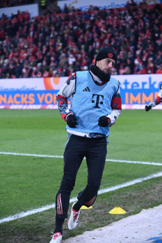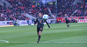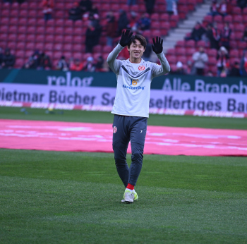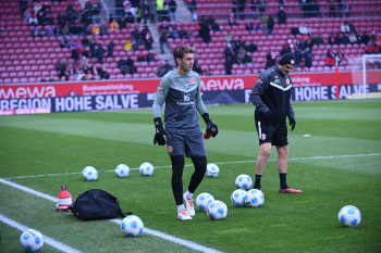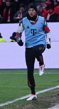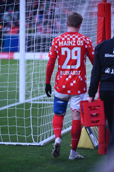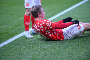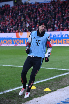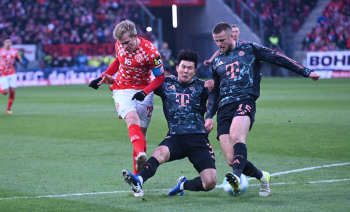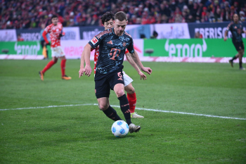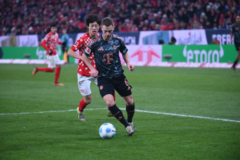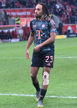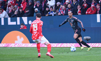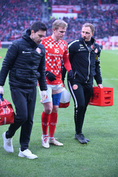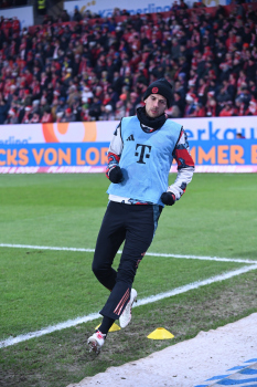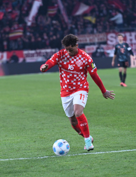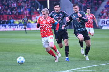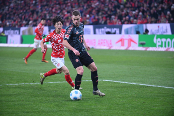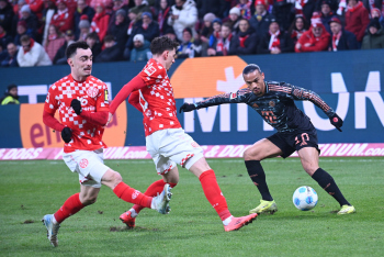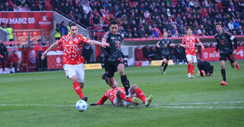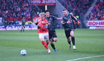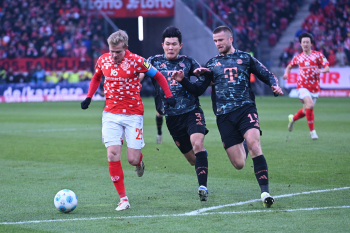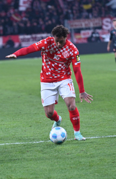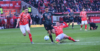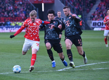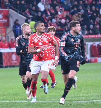 Dominik Kohr (1. FSV Mainz 05, 31) und Stefan Bell (1. FSV Mainz 05, 16) retten vor Jamal Musiala (FC Bayern München, 42)