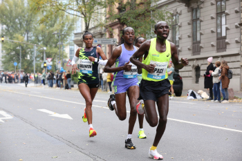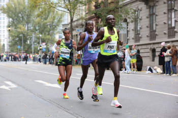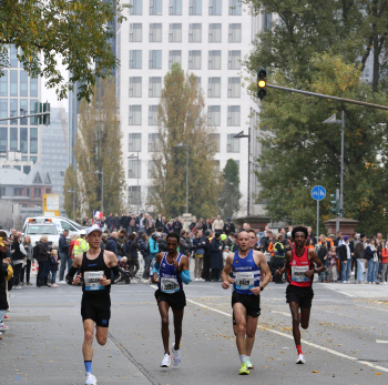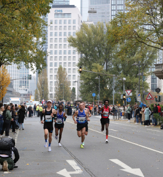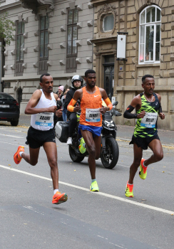 27.10.2024 xmgoodx Frankfurt am Main, mainova Frankfurt Marathon 2024 Topläufer Adamu Getahun ETH, Gebra Beyata Dibaba ETH, Belay Bezabeh ETH ********* Foto: Peter Hartenfelser