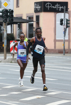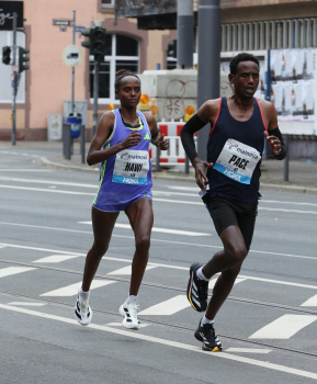 27.10.2024 xmgoodx Frankfurt am Main, mainova Frankfurt Marathon 2024 Läufer auf der Strecke zwischen den Pacemakern Selam Fente Gebru ETH und Agnes Keino KEN ********* Foto: Peter Hartenfelser