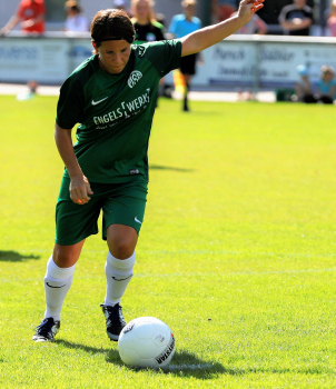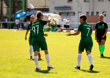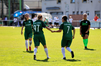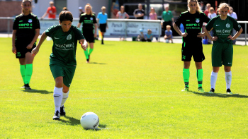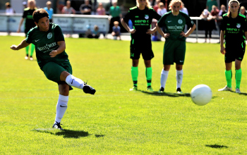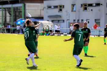 Meike Weber (TSG) führt den Elfmeter aus und verwandelt ihn, hier Torjubel mit Ginalolita Buglisi (TSG)