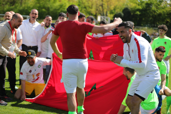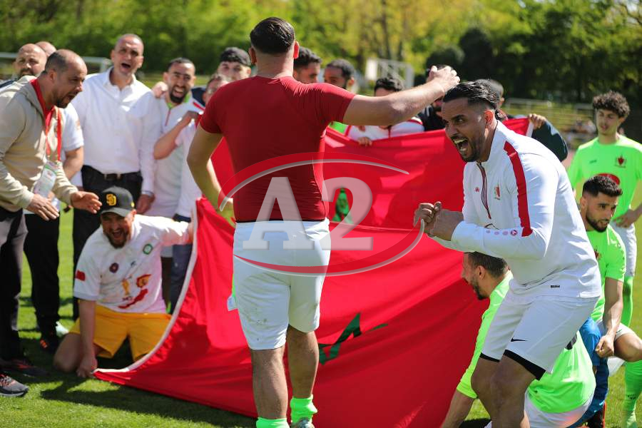 26.04.2026 xphx Neu-Isenburg KLA Saison 2025/2026 Spvgg. 03 Neu-Isenburg II - FC Maroc Offenbach Nach dem Sieg feiern Mannschaft und Trainer von Maroc ausgelassen ********* Foto: Peter Hartenfelser