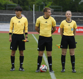 25.05.2025 Neu-Isenburg Fussball, Amateure Verbandsliga Spvgg. 03 Neu-Isenburg - SV Hummetroth Schiedsrichter Julien Scherthan mit seinen Assistenten Pius Granacher und Alina Lange ********* Foto: Peter Hartenfelser