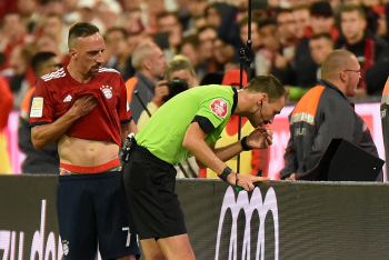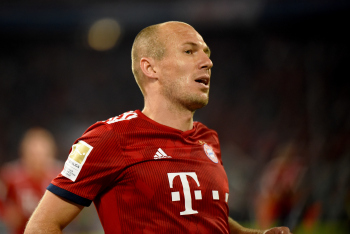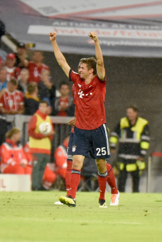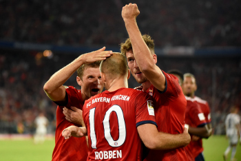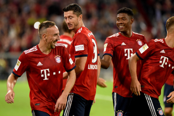 Jubel und Freude bei Thomas Müller (FC Bayern Muenchen), Torschütze Arjen Robben (FC Bayern Muenchen), Leon Goretzka (FC Bayern Muenchen), Thiago Alcantara (FC Bayern Muenchen) und James Rodriguez (FC Bayern Muenchen).