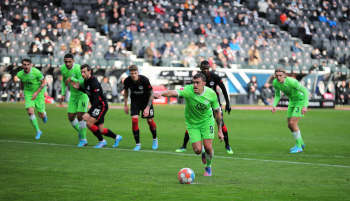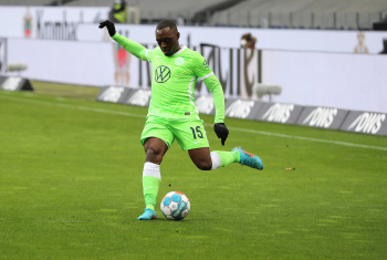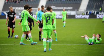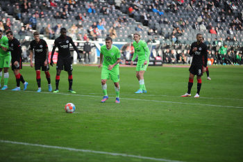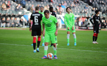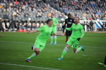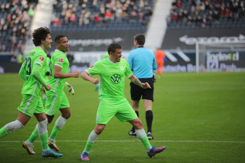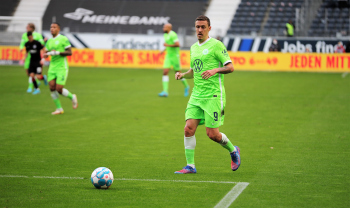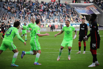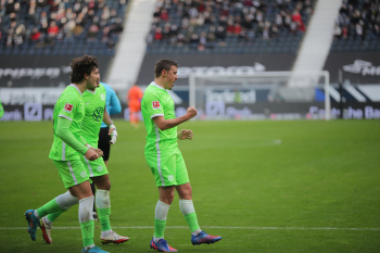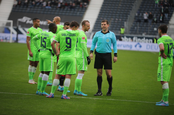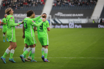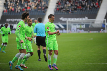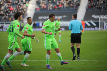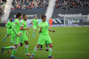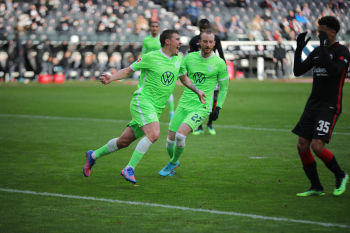 Max Kruse (9, Wolfsburg) verwandelt den Elfmeter zum Tor zum 0:1, danach großer Torjubel hier mit Maximiian Arnold,