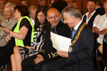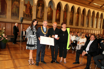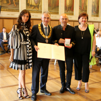 DJ, Musiker und Musikproduzenten Sven V?th erh?lt die Goetheplakette von OB Peter Feldmann, links Freundin Siliva und rechts die Mutter von SvenV?th