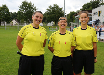 18.08.2019, xmgoodx Neu-Isenburg Frauen Regionlliga Süd Saison 2019/2020 TSG Neu-Isenburg - Eintracht Frankfurt Schiedsrichter:Ariane Lutz mit den Asisstentinnen L. Jazo und L.Badawie ****** Foto: Peter Hartenfelser