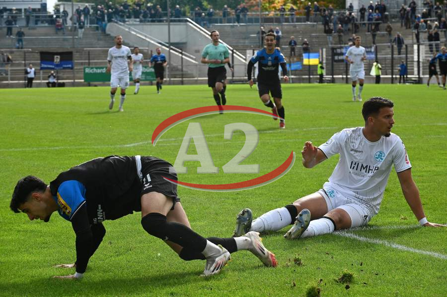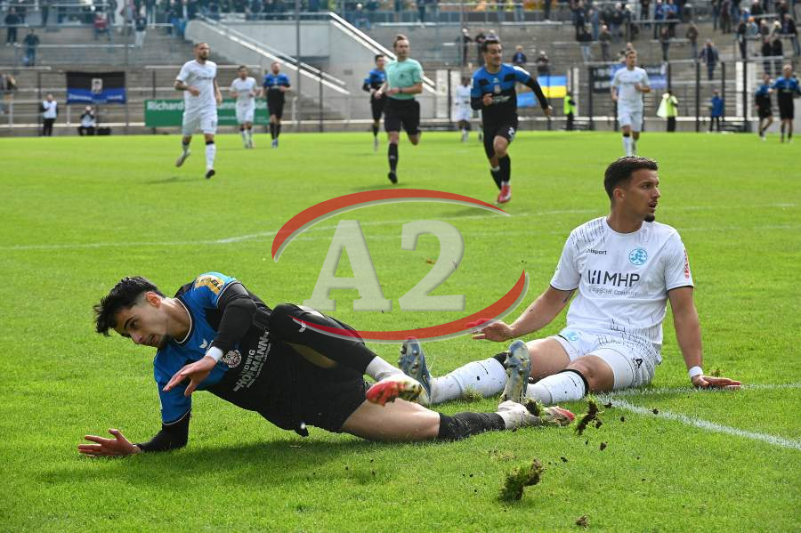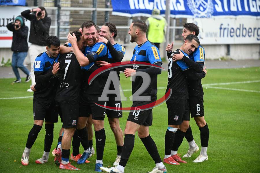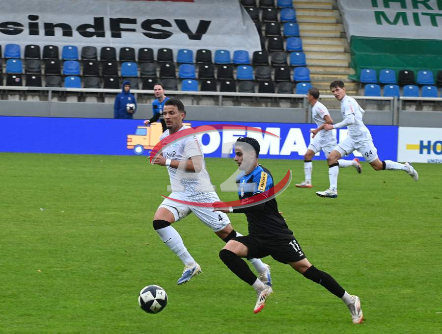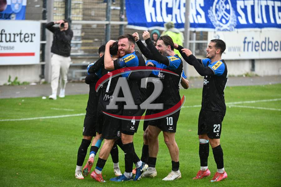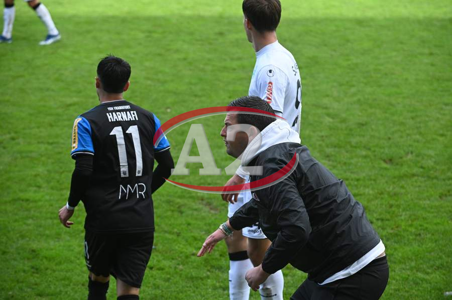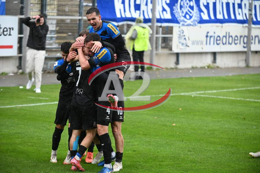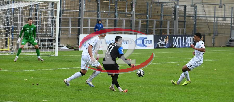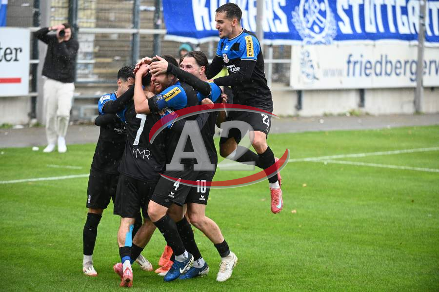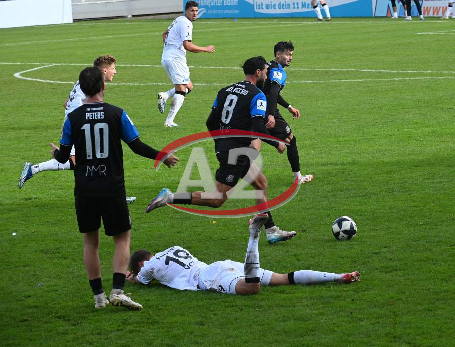 Nico Fundel (Stuttgarter Kickers) am Boden, Cas Peters (10, FSV Frankfurt), GIORGIO DEL VECCHIO (8, FSV Frankfurt), Ismail Harnafi (11, FSV Frankfurt)