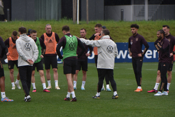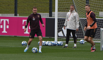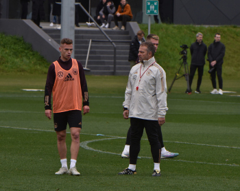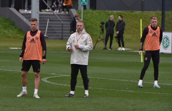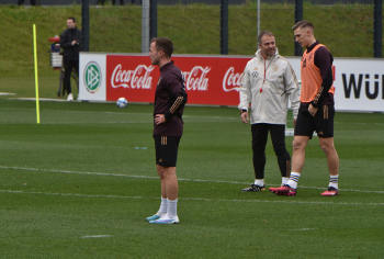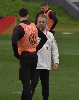 21.03.2023 Frankfurt am Main, DFB-Campus DFB A-Nationalmannschaft der Männer Training Bundestrainer Hansi Flich spricht u.a. mit Leon Goretzka (GER) ********* Foto: Peter Hartenfelser