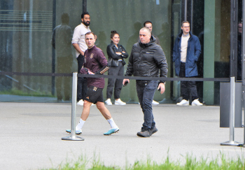 21.03.2023 Frankfurt am Main, DFB-Campus DFB A-Nationalmannschaft der Männer Training verläßt frühzeitig das Training Mario Götze (GER) hier mit Bodyguard ********* Foto: Peter Hartenfelser