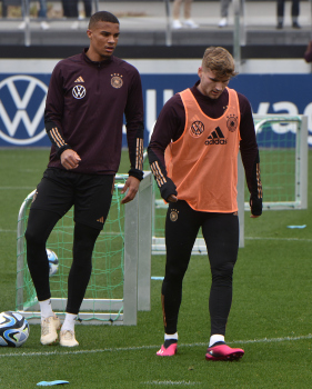 21.03.2023 Frankfurt am Main, DFB-Campus DFB A-Nationalmannschaft der Männer Training Mario Götze (GER) und Nico Schlotterbeck (GER) ********* Foto: Peter Hartenfelser