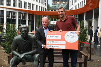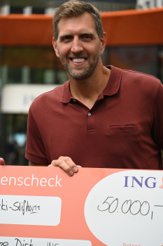 Bild zeigt Nick Jue Vorstandvorsitzender der ING in Deutschland und Dirk Nowitzki mit dem Scheck für die Dirk Nowitzk-Stiftung