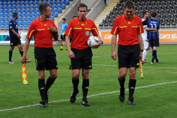 Schiedsrichter Tobias Stieler geht mit seinen mit seinen Assistenten Patrick Kalbhenn und Kai Vorderschmidt zufrieden vom Platz