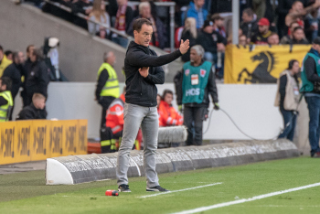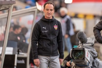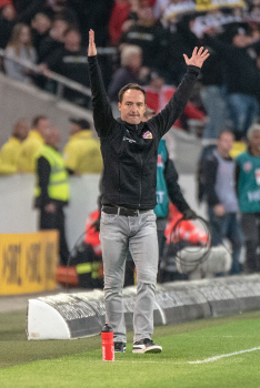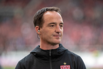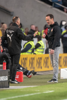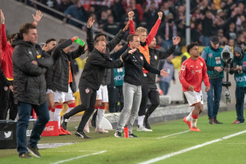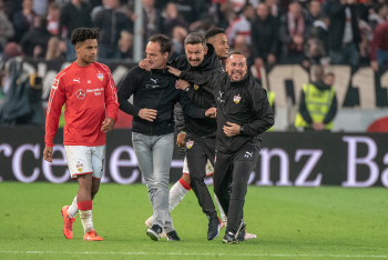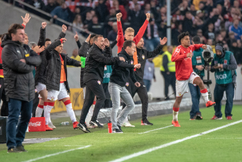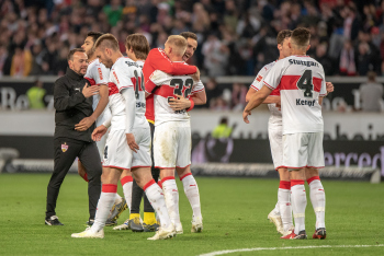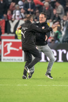 Jubel und Freude bei Co-Trainer Paco Vaz (VfB Stuttgart), Ozan Kabak (VfB Stuttgart), Torwart Jens Grahl (VfB Stuttgart), Andreas Beck (VfB Stuttgart), Benjamin Pavard (VfB Stuttgart) und Marc-Oliver Kempf (VfB Stuttgart).