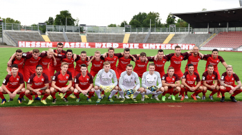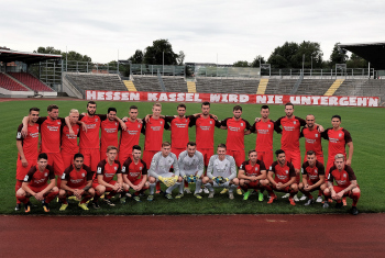 Die Fans des KSV Hessen Kassel haben ein grosses Transparent mit der Aufschrift gespannt - Hessen Kassel wird nie untergehen - davor die Mannschaft, die sich ?ber diese Unterst?tzung freut