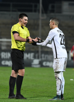 06.03.2020 xstux Frankfurt Regionalliga Südwest Saison 2019/2020 FSV Frankfurt - FC Gießen v.l. Schiedsrichter Justin Hasmann, Samir Benamar (Gießen) *** Foto: Peter Hartenfelser