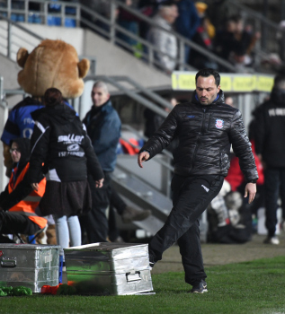 06.03.2020 xstux Frankfurt Regionalliga Südwest Saison 2019/2020 FSV Frankfurt - FC Gießen v.l. Trainer Thomas Brendel tritt gegen die Box (FSV) *** Foto: Peter Hartenfelser