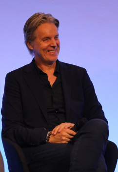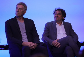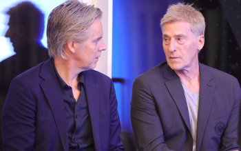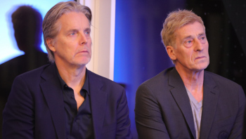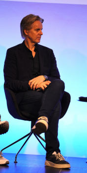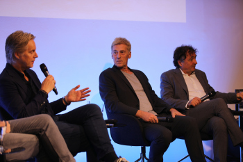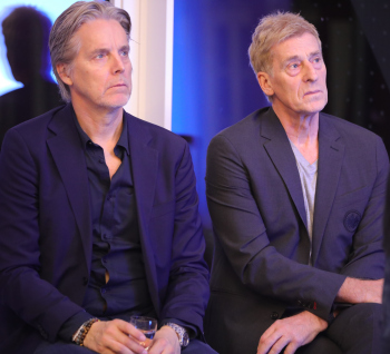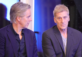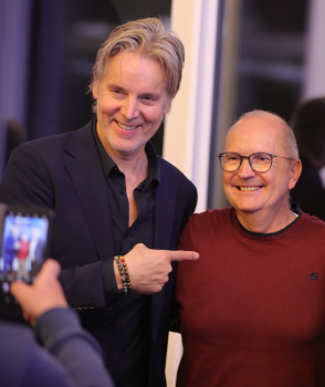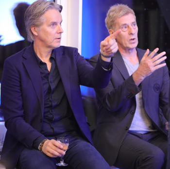 Bild zeigt: Markenbotschafter und Ex-Profis Jan Åge Fjørtoft und Uli Stein mit Autor Michael Horeni