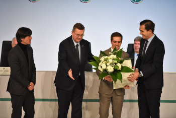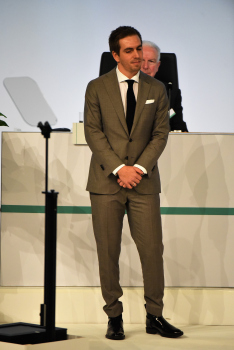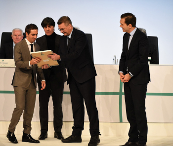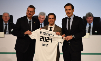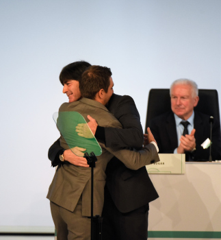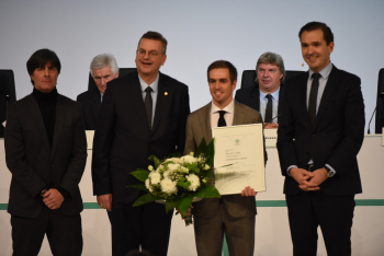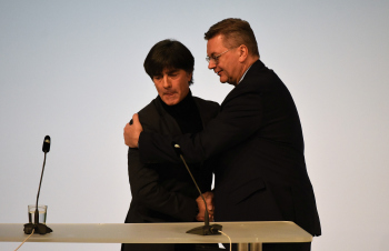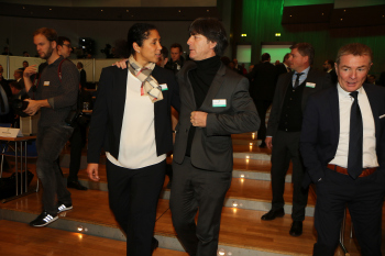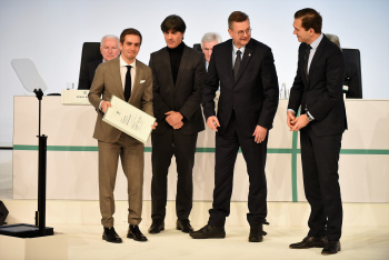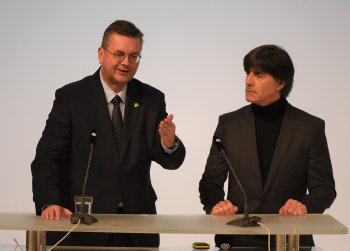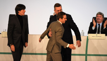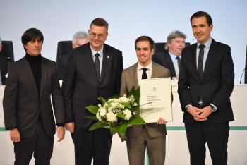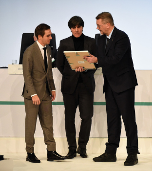 Bundestrainer Joachim Löw, DFB-Präsident Reinhard Grindel, Dr. Friedrich Curtius. Generalsekretär DFB mit Philipp Lahm und der Ehrenurkunde, daneben Dr. Friedrich Curtius. Generalsekretär DFB