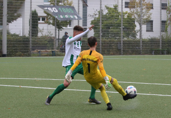 06.10.2019, xmgoodx Neu-Isenburg, Buchenbusch KOL KOL Saison 2019/2020 TSG Neu-Isenburg - Spvgg. 03 Neu-Isenburg II David Kammholz (TSG) gegen Torwart Henrik Jöckel (03) ****** Foto: Peter Hartenfelser