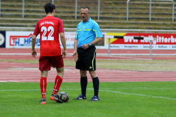 20.5.2018 Neu-Isenburg, Portpark KLA Offenbach Saison 2017/2018 Spvgg. 03 Neu-Isenburg II gegen HFC Bürgel Schiedsrichter Werner Bungert (Mömbris) ermahnt Andre Christian Laux (Spvgg. 03 Neu-Isenburg II) *** Foto: A2/Hartenfelser