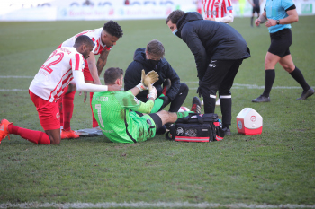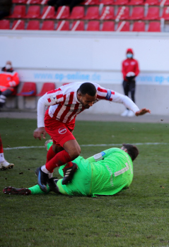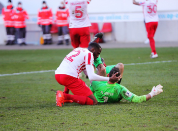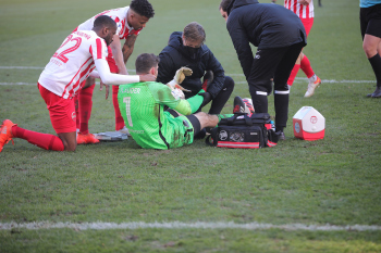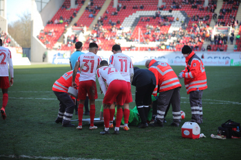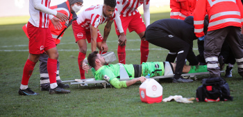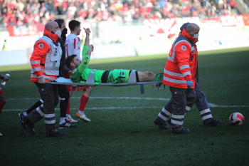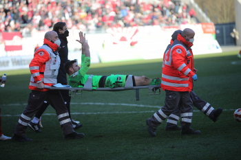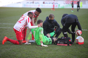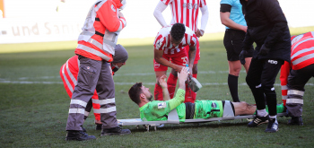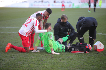 Torwart Stephan Flauder (1, OFC) und Jayson Breitenbach (27, OFC) prallen zusammen und Torwart Stephan Flauder (1, OFC) wird verletzt und muss vom Platz getragen werden