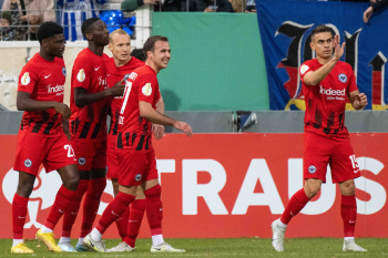 Frankfurter Torjubel v.l. Junior Dina Ebimbe, Torschütze Randal Kolo Muani, Sebastian Rode, Mario Götze und Rafael Santos Borre Maury (Eintracht Frankfurt).