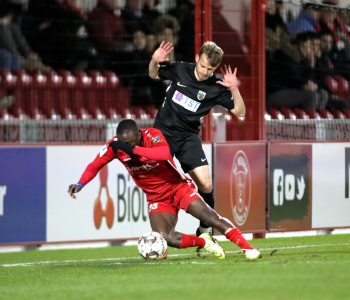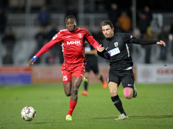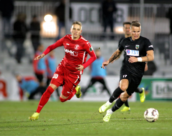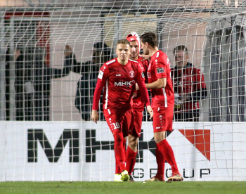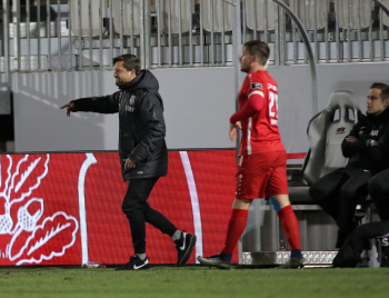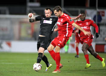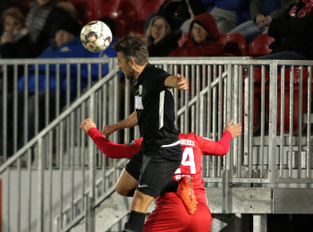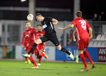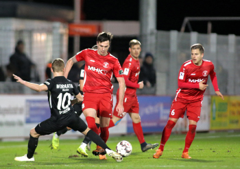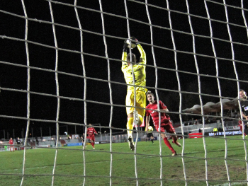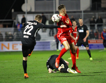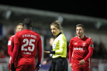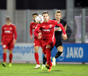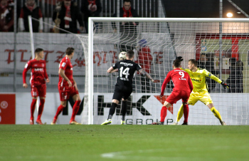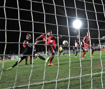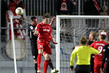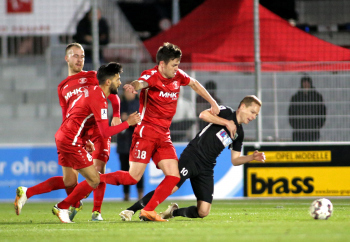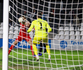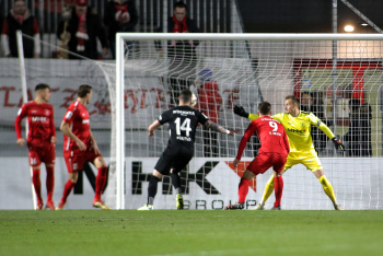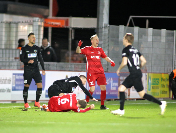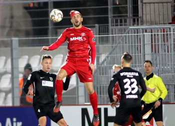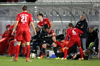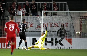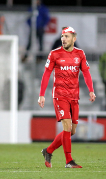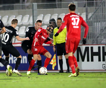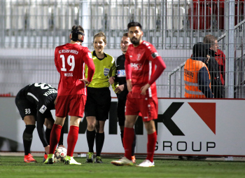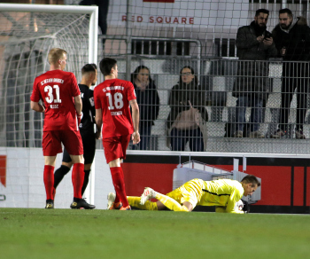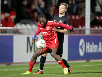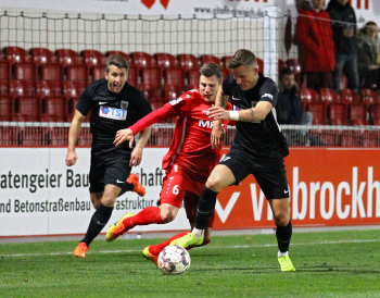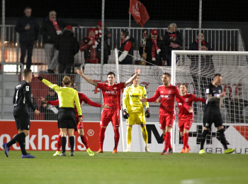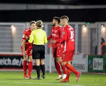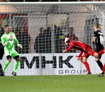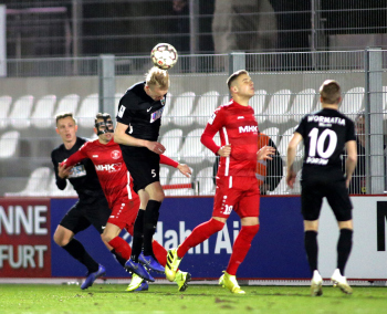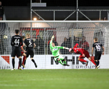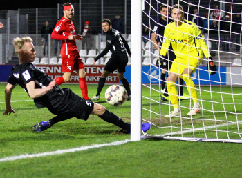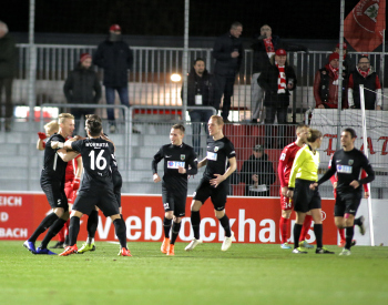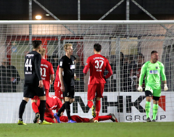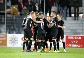 12.03.2019, xxx, Dreieich, Fussball, Hahnair Sportpark, Regionalliga Suedwest, Saison 2018/2019, SC Hessen Dreieich gegen Wormatia Worms; Tor zum 1:1 durch Kai Hesse (SC Hessen Dreieich), in der 90. Minute, Chris Keilmann Torwart (VfR Wormatia Worms), Torjubel mi rechts Dominic Rau (SC Hessen Dreieich), und Toni Reljic (SC Hessen Dreieich), gelbe Schuhe