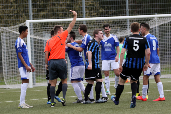 03.04.2016, Heusenstamm Martinsee Saison 2015/2016 TSV Heusenstamm - Kickers Obertshausen Schiedsrichter Manuel Tauber (Rossdorf) zeigt Giorgio Modica (Heusenstamm) die rote Karte ********** Foto: Peter Hartenfelser
